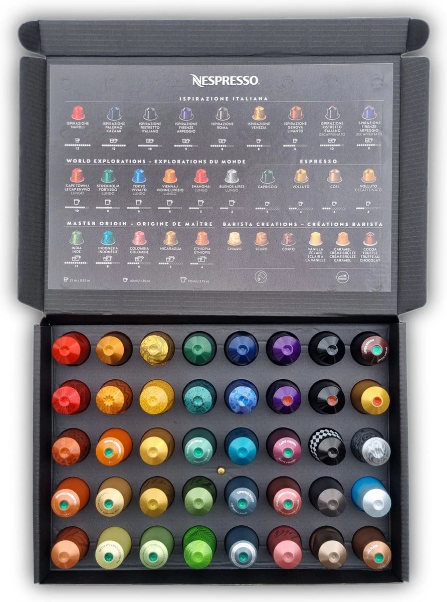 Uit het gehele assortiment koffiecapsules hebben we maar liefst 40 smaken gekozen, deze kunnen per bestelling verschillen. Zo heb je de mogelijkheid om zonder dat je gelijk een grote verpakking hoeft te kopen eens een andere smaak te proberen. En het is natuurlijk een leuk kado om te krijgen en te geven.