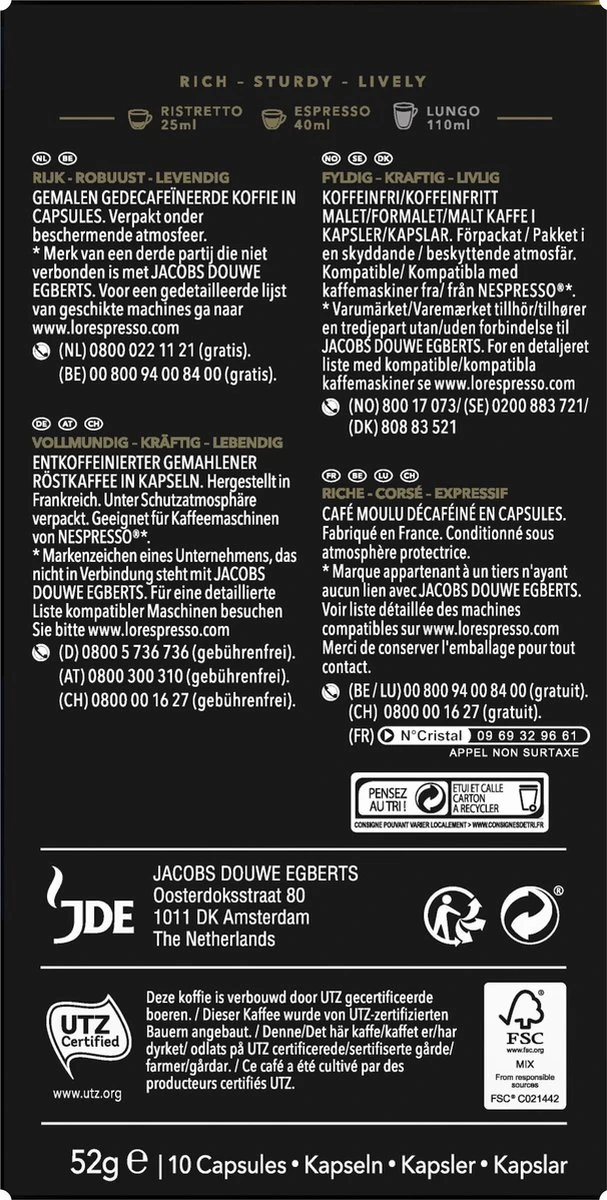 De volle, intense en rijke Ristretto Decaffeinato: een smaakvolle melange met levendige houtachtige geuren, gelaagd met noten van geroosterde amandelen en afgerond met een fijn gouden crèmelaag. Cafeïnevrij.